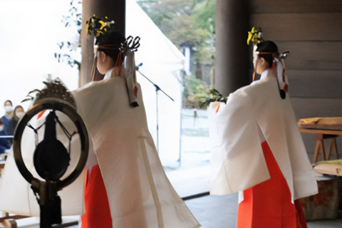 | 巫女(みこ)は、神社で神さまに仕える女性のことで、神職(しんしょく)と一緒に、古くからの神社の伝統、文化に基づきお祭りやご祈祷の奉仕をしたり、ご参拝の方へお札やお守りを授与するなど大切な役割を担っています。古来、未婚の女性が奉仕するという伝統から、現在も20代~30代の巫女が多くの神社でご奉仕しています。 また、ご奉仕の傍ら、茶道や華道などのお稽古を通して日本の文化に親しみ、日本の文化を継承してゆくことも大切な役割の一つです。 |